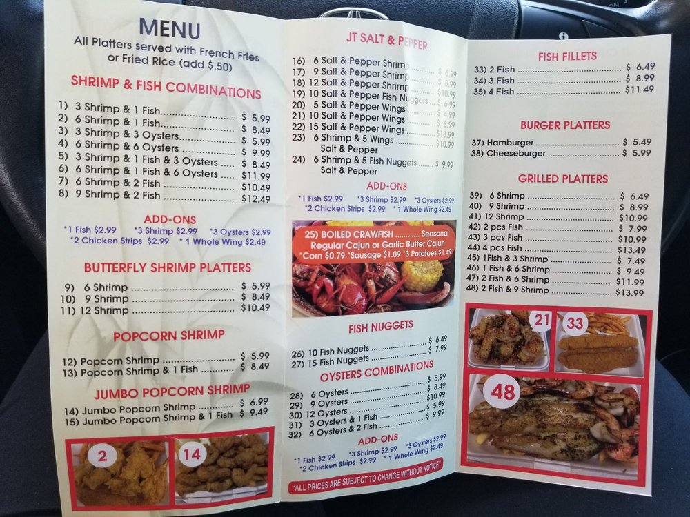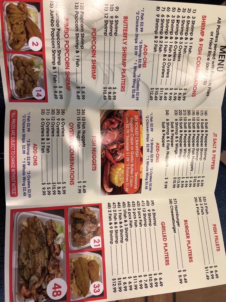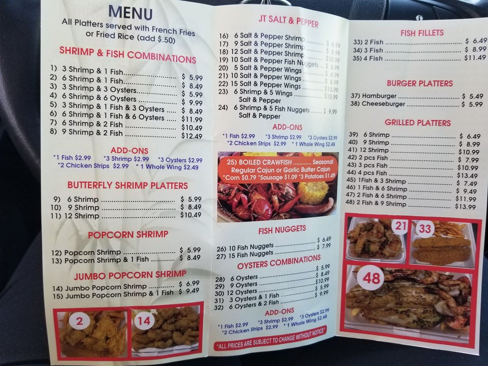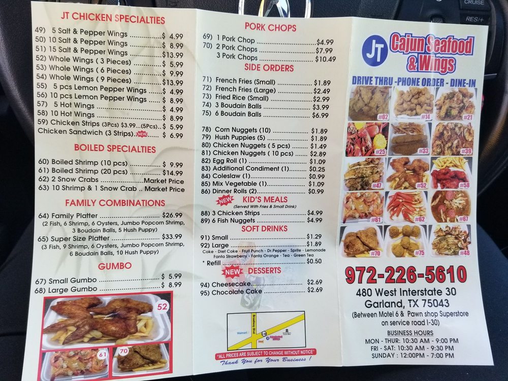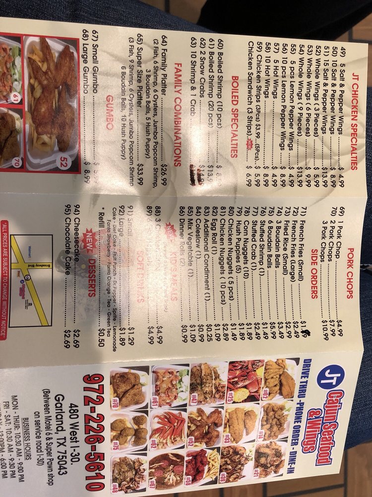 JT Cajun, located in Garland, TX, offers a wide variety of Cajun/Creole seafood dishes, catering to individuals and groups looking for a delicious dining experience. With options like shrimp and fish combinations, butterfly shrimp platters, and popcorn shrimp, the menu is filled with flavorful choices at affordable prices. Customers rave about the fresh seafood, perfectly seasoned dishes, and generous portions. Highlights include the Boudain Balls appetizer, crispy and flavorful wings, and perfectly cooked crawfish and shrimp. The ambiance may not be fancy, but the food more than makes up for it. Friendly service and reasonable prices add to the overall positive dining experience. If you're a seafood lover looking for authentic Cajun cuisine, JT Cajun is a must-visit spot.